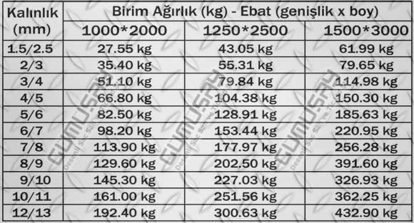 Aşağıdaki tabloda gözüktüğü gibi, gözyaşı desenli sacların standart En x Boyda imal edilir. Bu ölçü değişmekle birlikte genelde 1000x2000mm - 1200x2400mm - 1250x2500mm - 1200x3000mm - 1250x3000mm -1500x3000mm - 1500x4000mm - 1500x6000mm ebatlarında imal edilir. Sac kalınlıkları ise 2-3mm , 3-4mm, 4-5mm , 5-6mm , 7-8mm , 8-9mm , 9-10mm , 10-11mm , 11-12mm , 12-13mm , 13-14mm , 14-15mm , 15-16mm olarak değişkenlik gösterir.